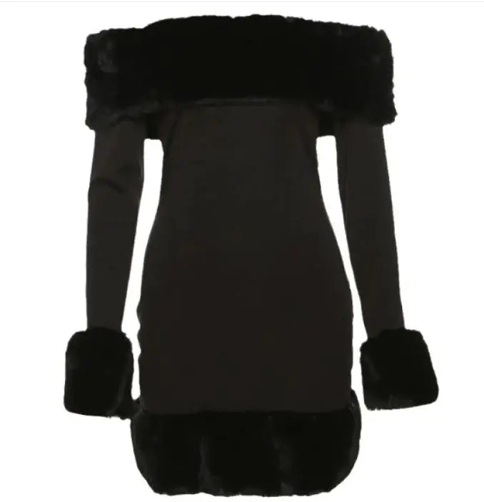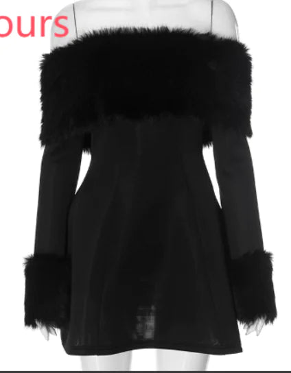 Chic Fluffy Fur Collar Patchwork Black Mini Dress