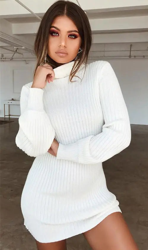 High Neck Long Sleeve Ribbed Mini Dress